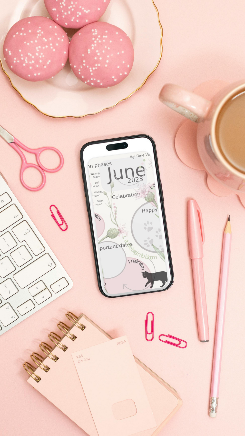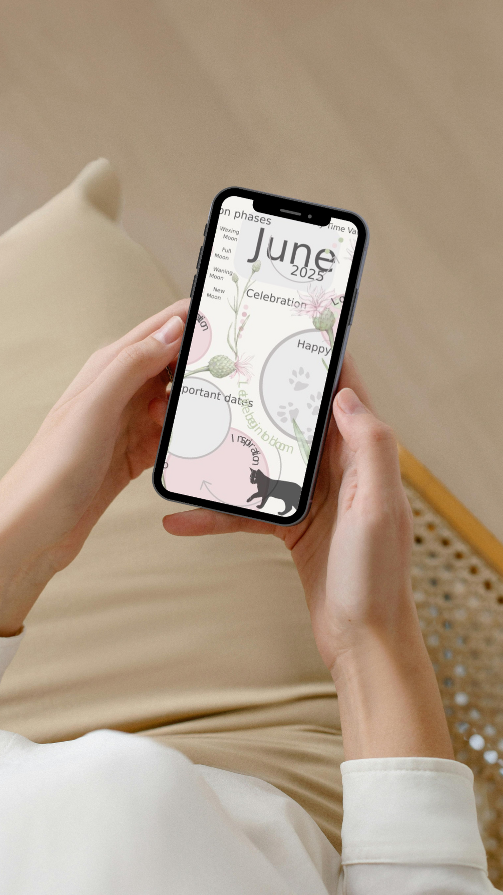 What’s included: – June 2025 calendar overview – Moon phases (Full, New, Waxing & Waning) – Sections for: ✦ Affirmations ✦ Important dates ✦ Happy events ✦ Personal values & intentions ✦ Monthly celebration notes ✦ Your inspirations – Unique hand-drawn floral design with calming colors – Adorable black cat for a touch of charm